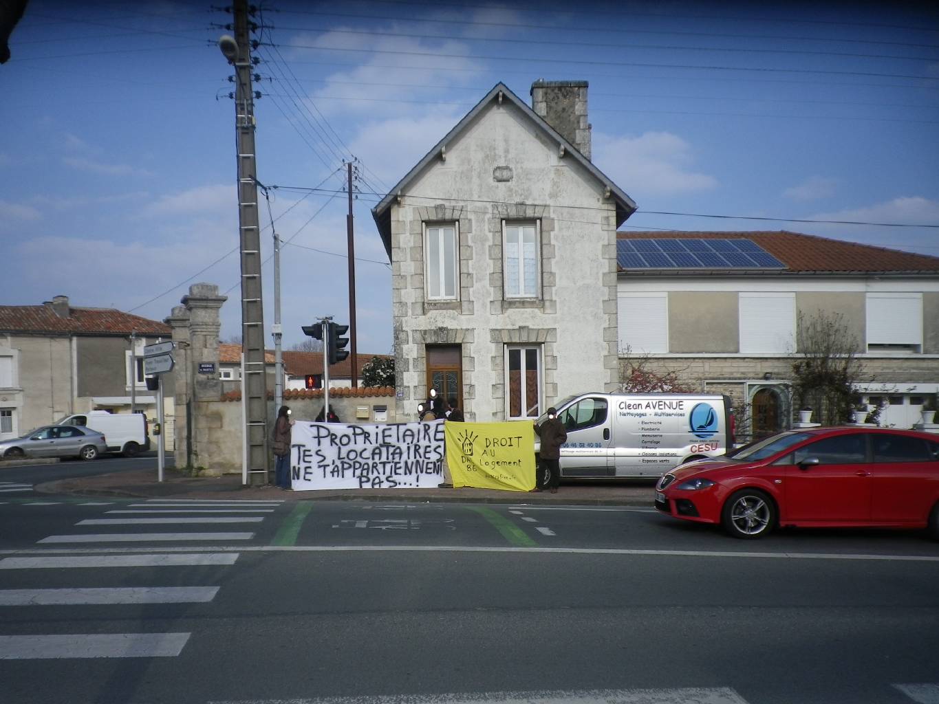 Donc, hier 27 mars vers 17h, nous nous sommes déplacés à une dizaine de militants du Dal86 pour le rencontrer chez lui. Malgré notre insistance, il n’a pas voulu nous recevoir prétextant un rendez-vous urgent. Nous avons déployé nos banderoles « Propriétaire, tes locataires ne t’appartiennent pas » et « Droit au logement 86 » et sommes restés devant chez lui une heure.